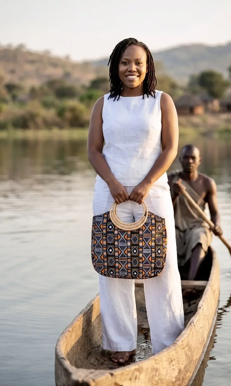 Confectionné à partir de tissu aux motifs graphiques et doté d’anses en rotin tressé, il reflète un savoir-faire artisanal et une esthétique authentique. Chaque détail évoque un lien profond avec la matière, l’origine et le geste.